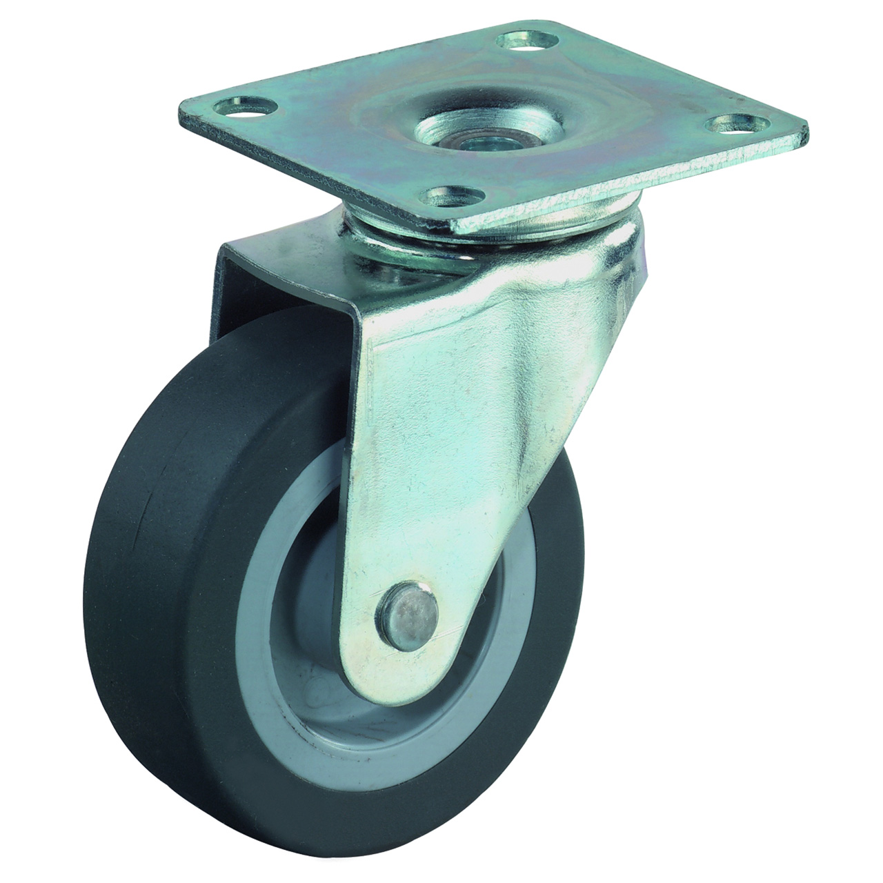 Plastové nábytkové kolečko s šedým pryžovým nešpinícím běhounem v otočné vidlici s uchycením na plotnu na čtyři šrouby