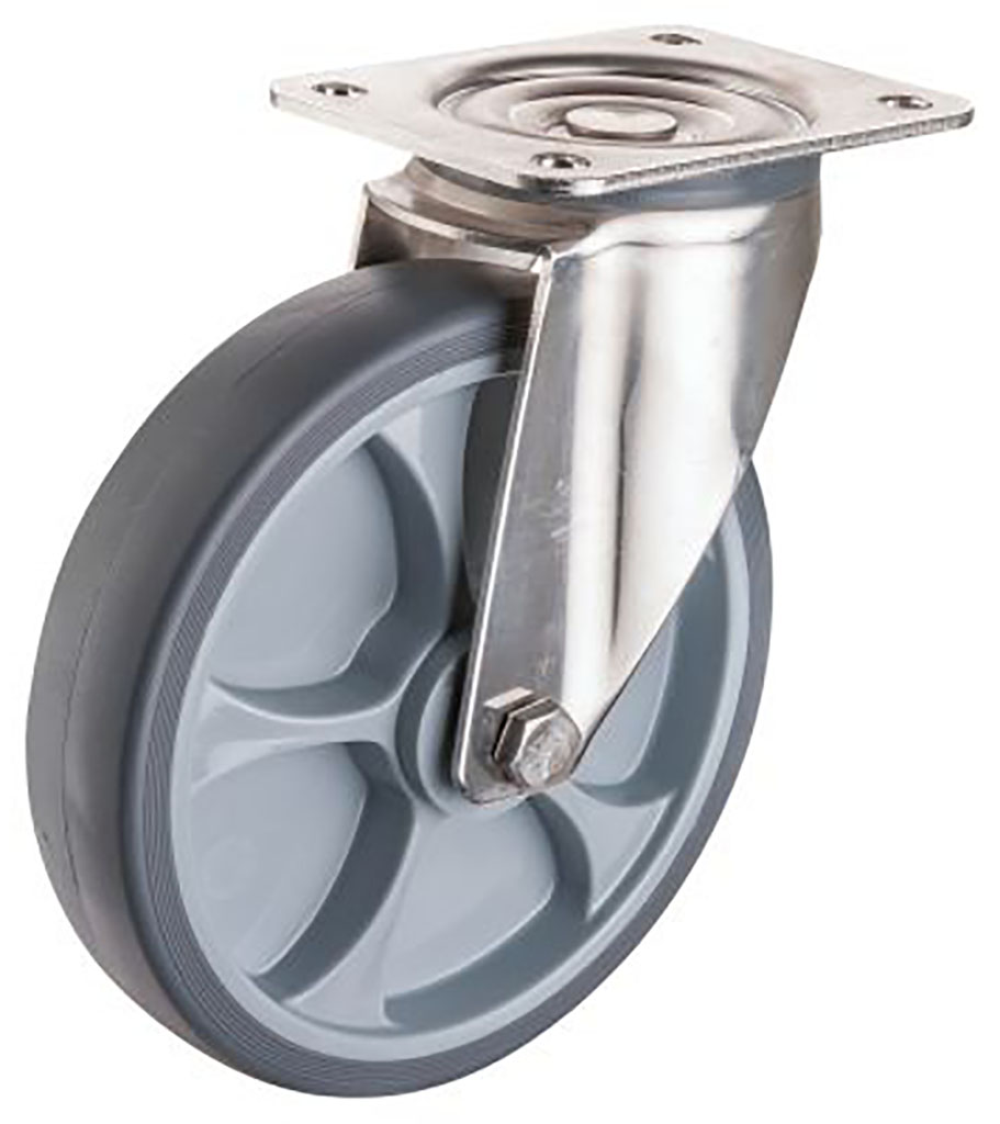 vidlice: nerezový plech s dvojitým kuličkovým věncem, kolo: plastové s šedou nešpinící gumou na kluzném ložisku