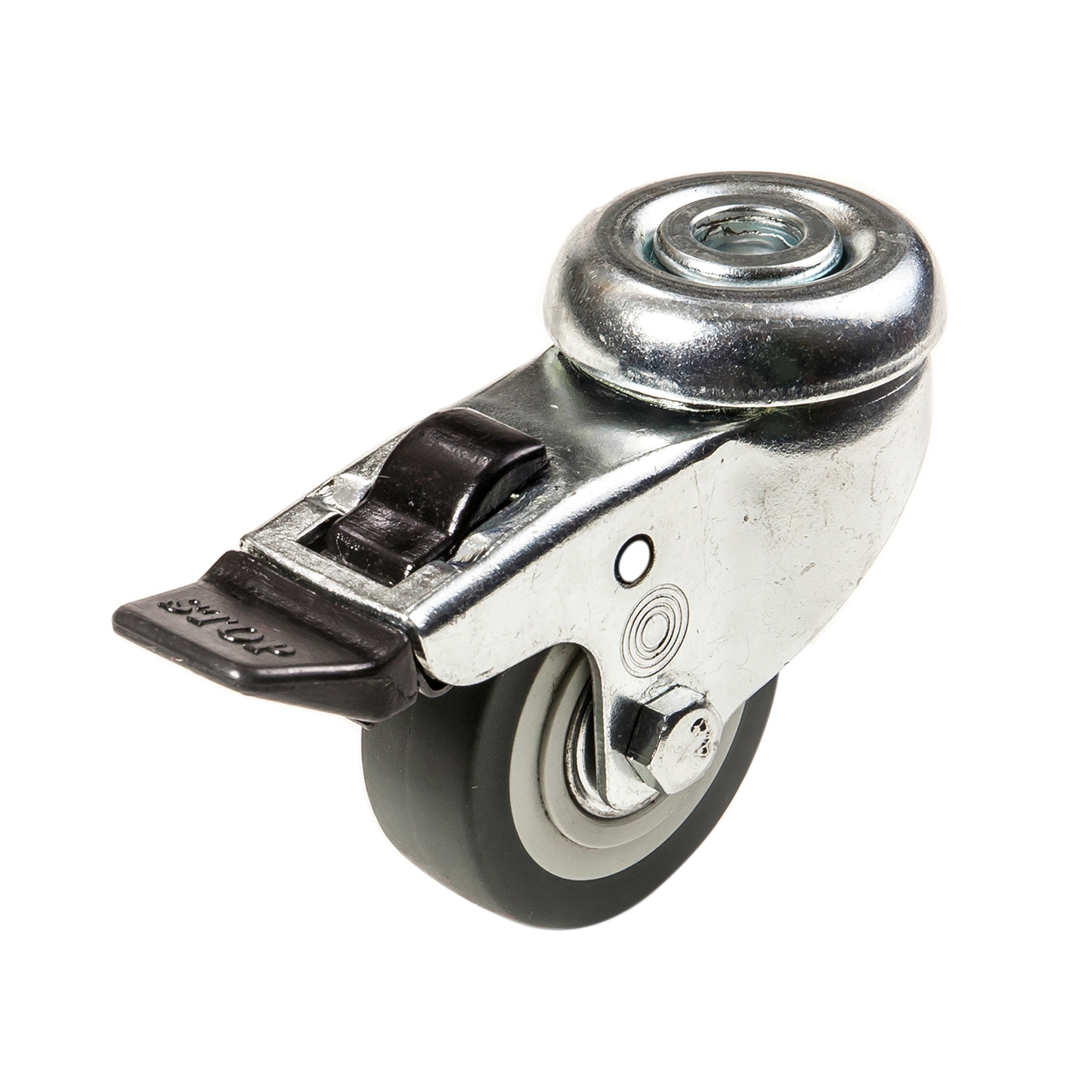 Plastové nábytkové kolečko s kuličkovým ložiskem s šedým pryžovým nešpinícím běhounem v otočné vidlici s brzdou s uchycením na jeden šroub