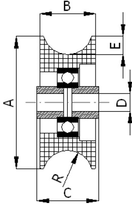 | Název | Typ ložiska | Zatížení [kg] | Šířka drážky kladky ( průměr lana ) [mm] | D [mm] | B [mm] | A [mm] | C [mm] | E [mm] | R [mm] | Cena [bez DPH] | |