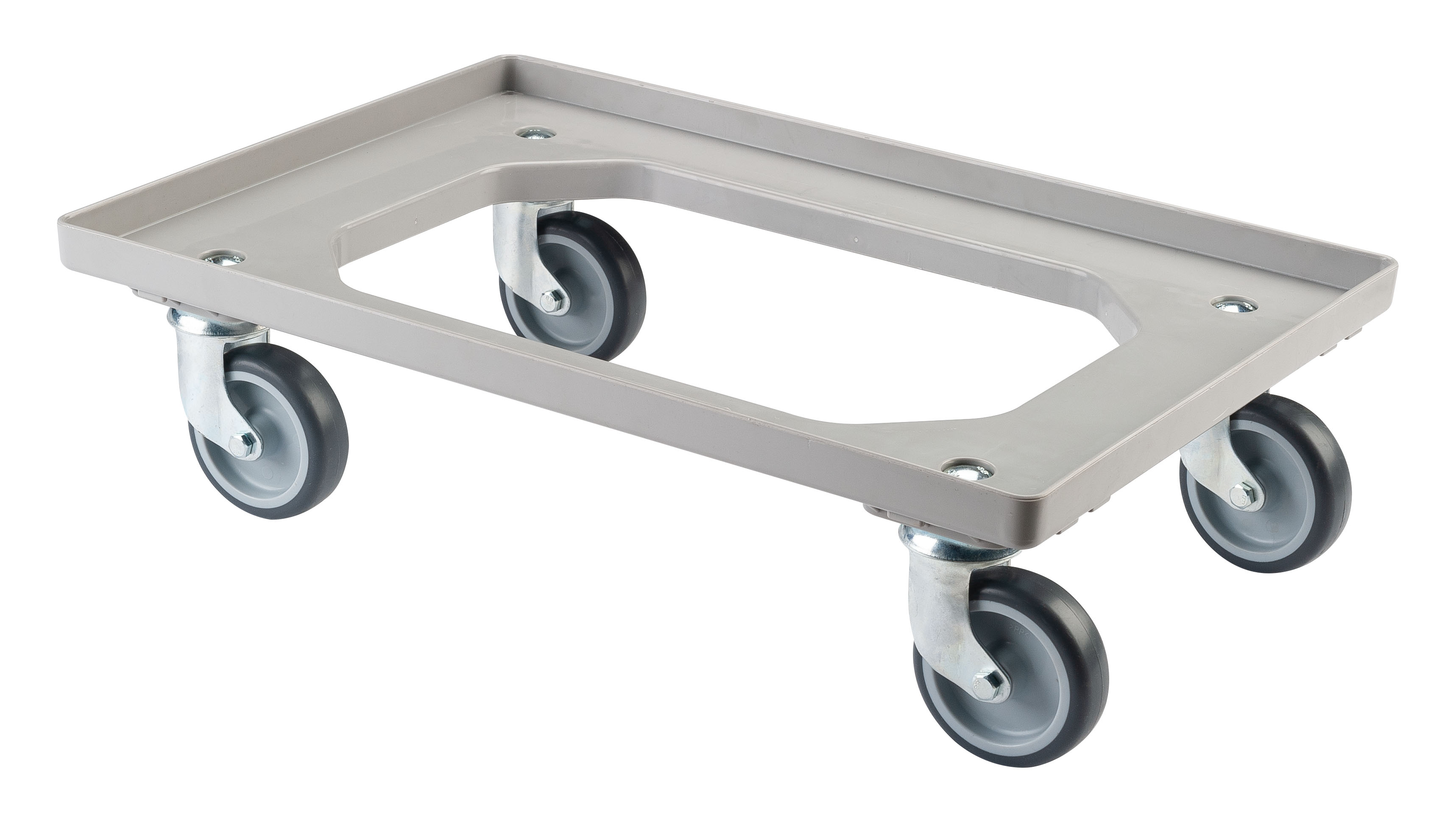Trasnportní vozík pro přepravky nebo krabice o rozměru 60x40 cm, opatřen otočnými kolečky s běhounem ze šedé neznačkující termoplastické pryže.